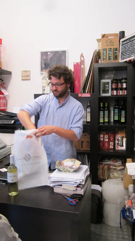 Siamo da “La bottega del vinaiolo”, aperta da poco più di un anno. Avete letto bene “vinaiolo“, termine pochissimo usato per indicare il “vinaio“, colui che vende vino.