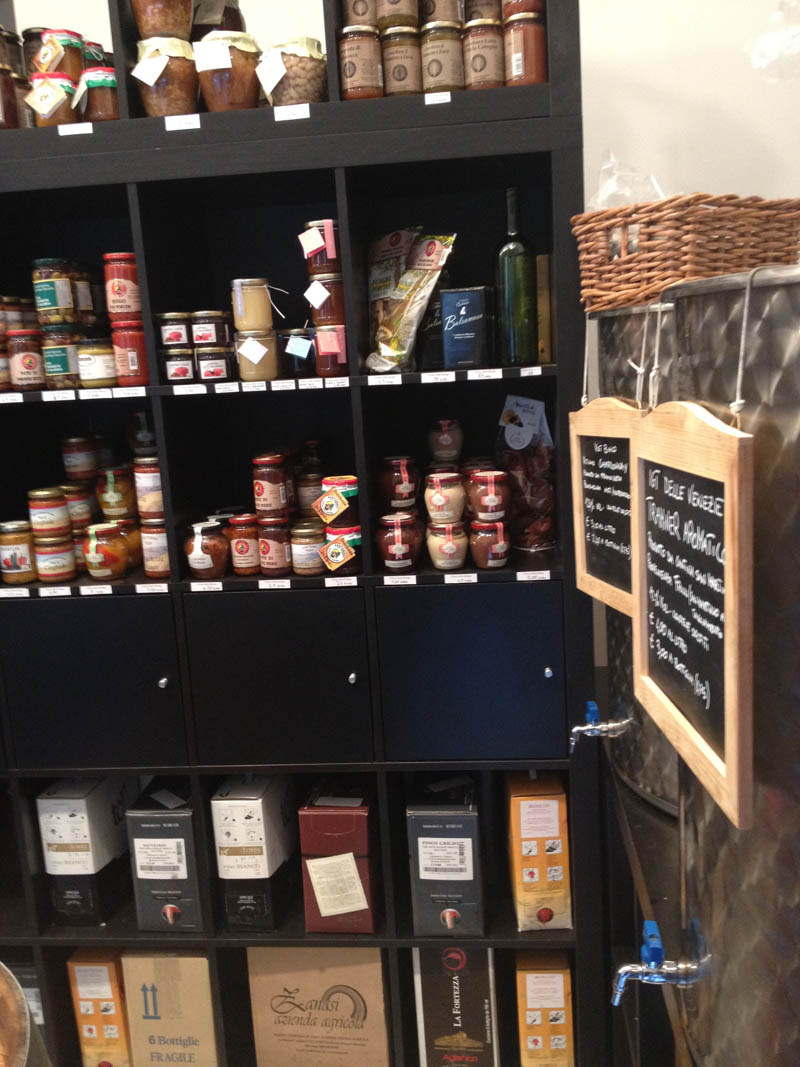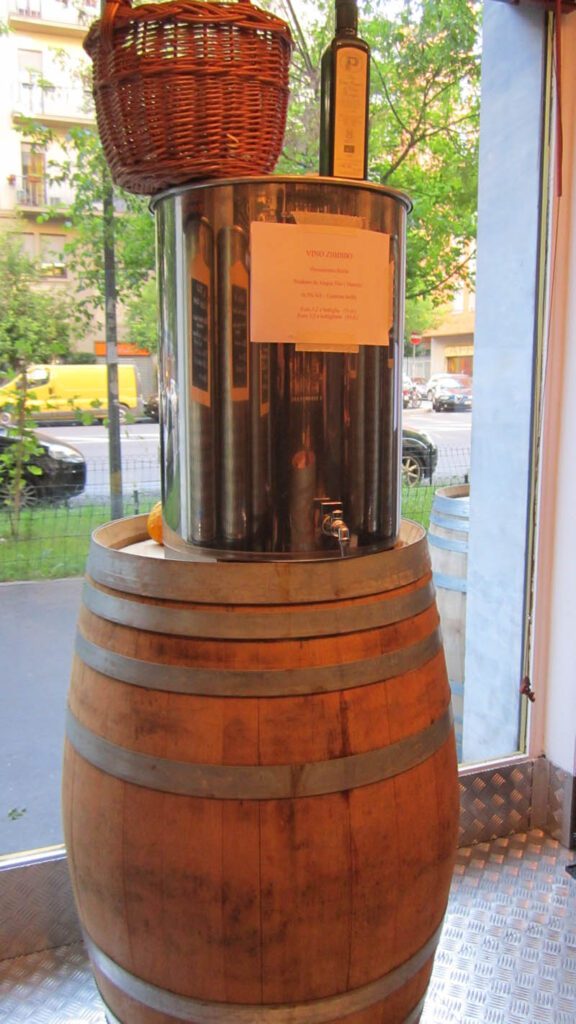 Due vetrine, e poco spazio all’interno, occupato da una parte dalle botti di vino sfuso (quasi una decina di tipologie tra bianchi, rossi e frizzanti)