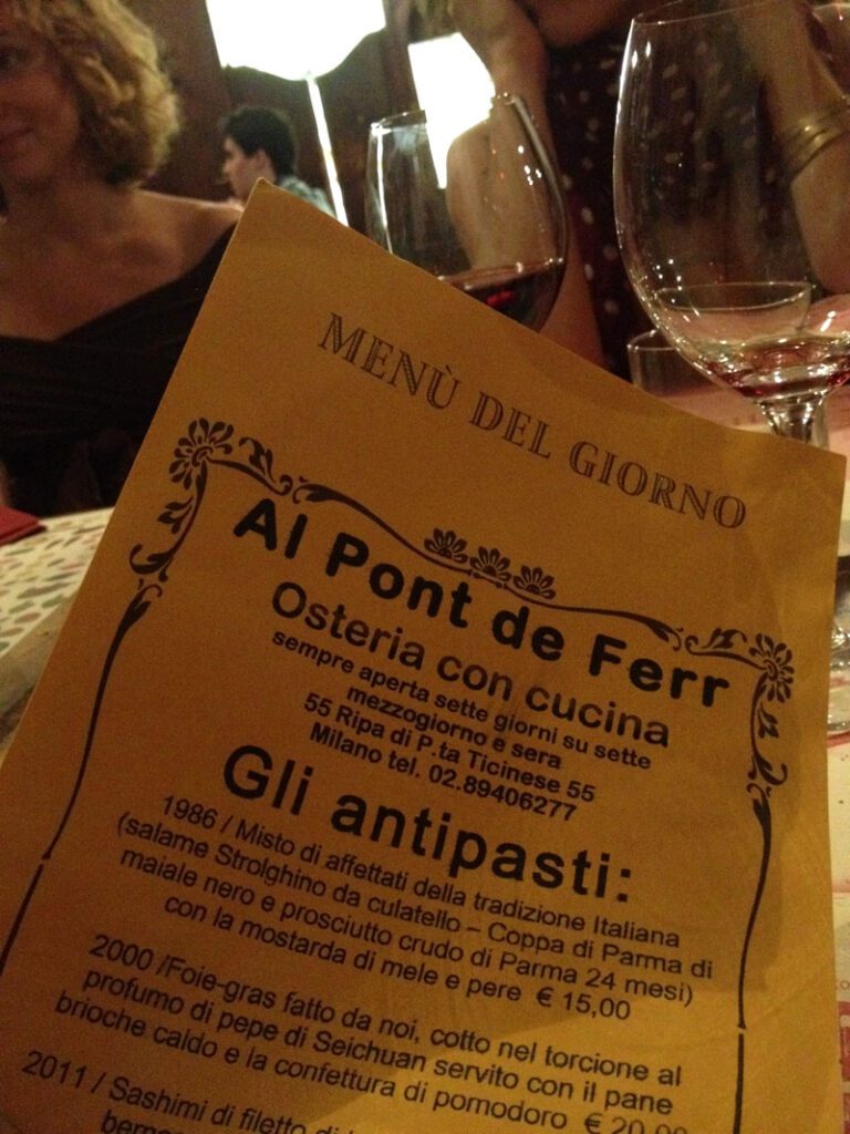 Vicino al ponte di ferro che passa tra Ripa di Porta Ticinese e l’Alzaia Naviglio Grande, troviamo questa osteria che riprende il nome milanese del ponte: Al pont de ferr.