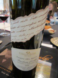 Tocca poi alla Barbera d’Alba Campo del Gatto 2009. Al naso colpisce subito per l’impronta langarola, naso fruttato, complesso, per niente banale. In bocca un’ottimo equilibrio tra tannino e acidità. Accompagnato con tortelli allo stufato di manzo, pastinaca, chiodini, foglie di senape, ne smorzava con la freschezza la parte grassa e bilanciava la sapidità del ripieno di carne.