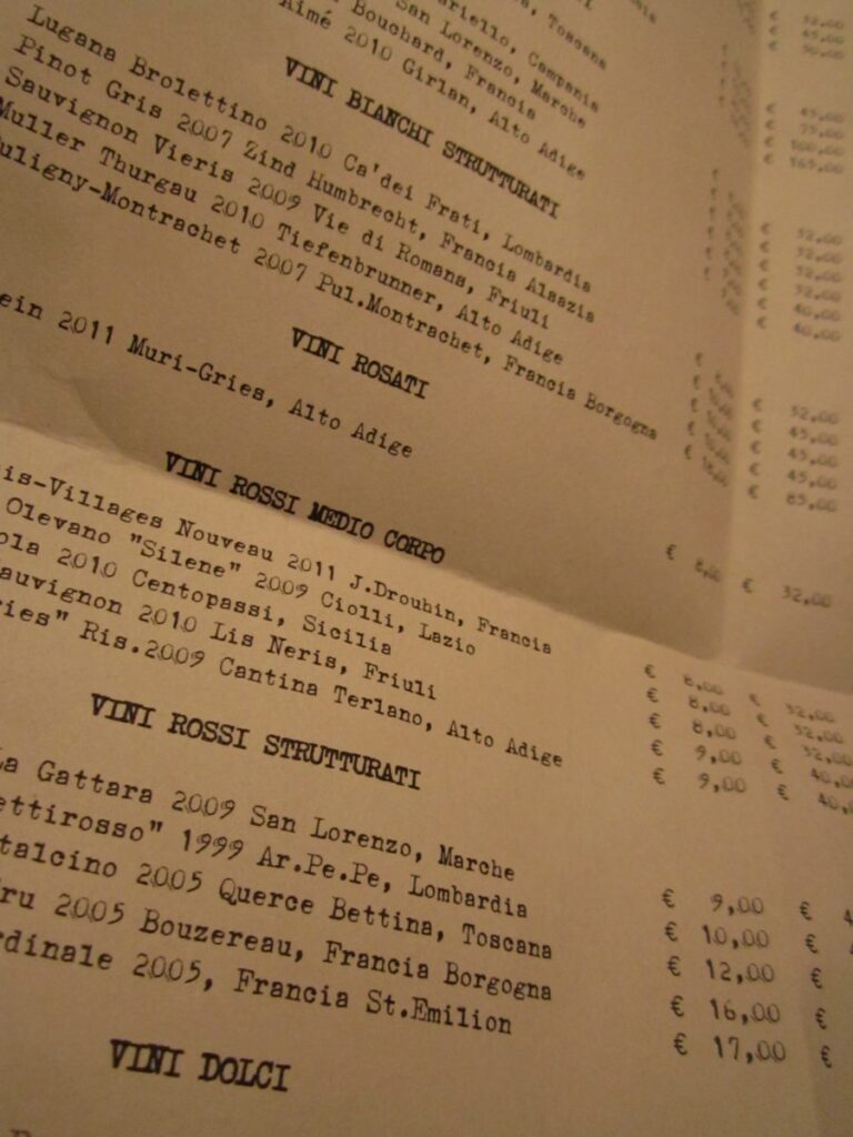 La carta dei vini al calice comprende più di trenta etichette, di cui almeno un terzo francesi. Produttori grandi, ma anche produttori più piccoli e ben conosciuti dagli appassionati (Ar.pe.pe., Picariello, eccetera)