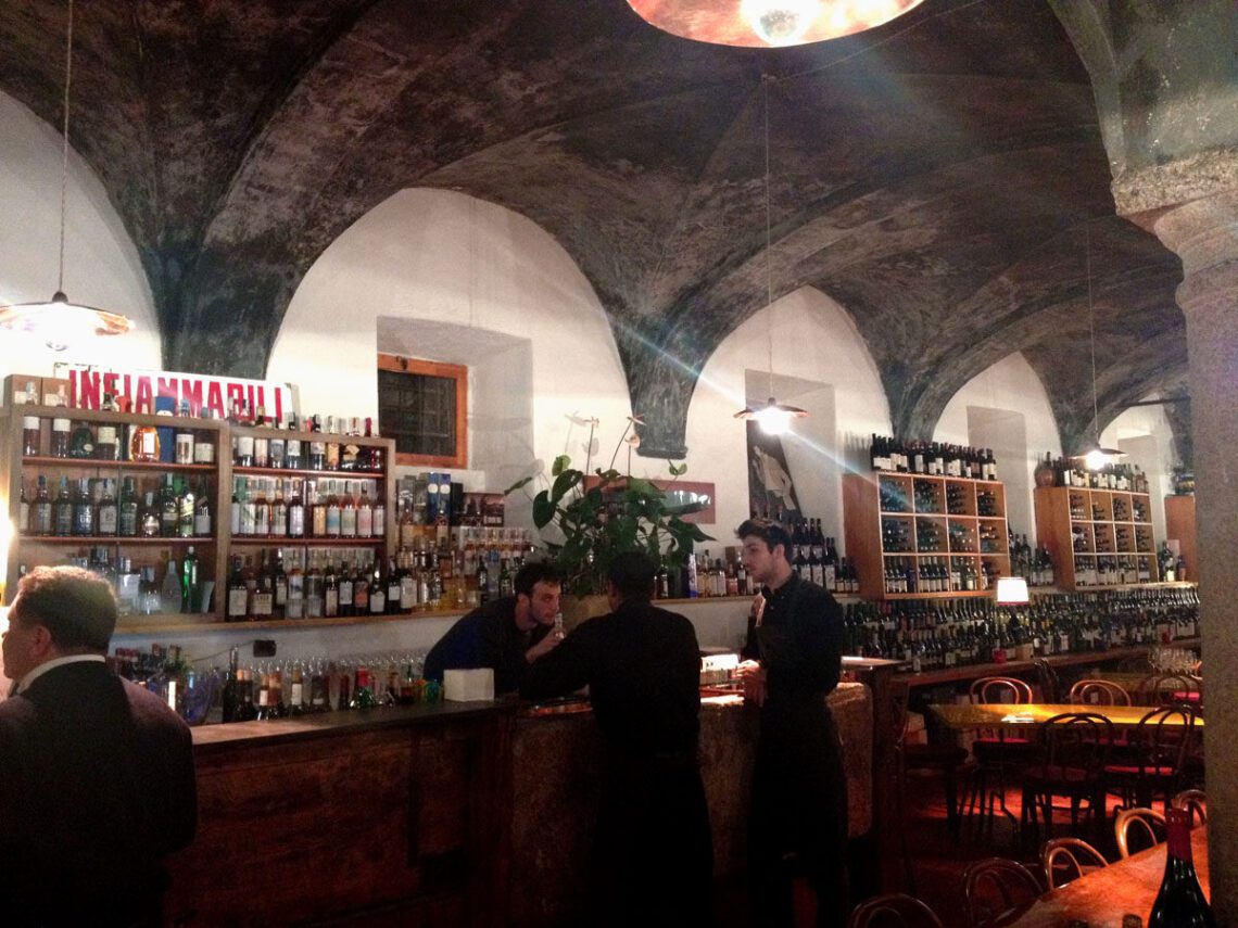 n’ombra de vin, enoteca storica di Milano, si affaccia su Via San Marco, con gente più fuori che dentro (sia per lo spazio limitato della zona bar, sia per farsi vedere…).