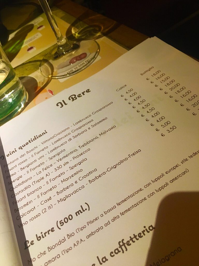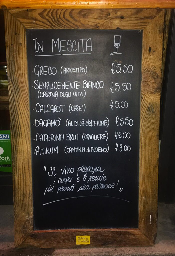 I vini in mescita non sono molti, ma c’è sempre qualche proposta modenese, così come la carta vini con le bottiglie intere che prevede una proposta di vini artigianali non solo emiliana, ma anche del resto d’Italia.