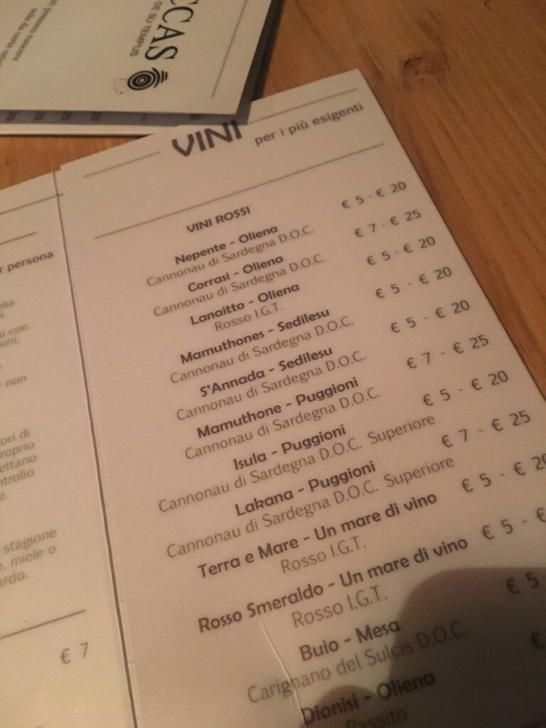 E poi c’è la proposta vini… a dir la verità un po’ limitata e soprattutto orientata quasi esclusivamente alle grandi cantine sarde, che avranno anche i loro meriti, ma se ti presenti come un locale che ricerca la specialità sarda, ci si aspetta che anche sul vino si dia spazio a qualche artigiano.