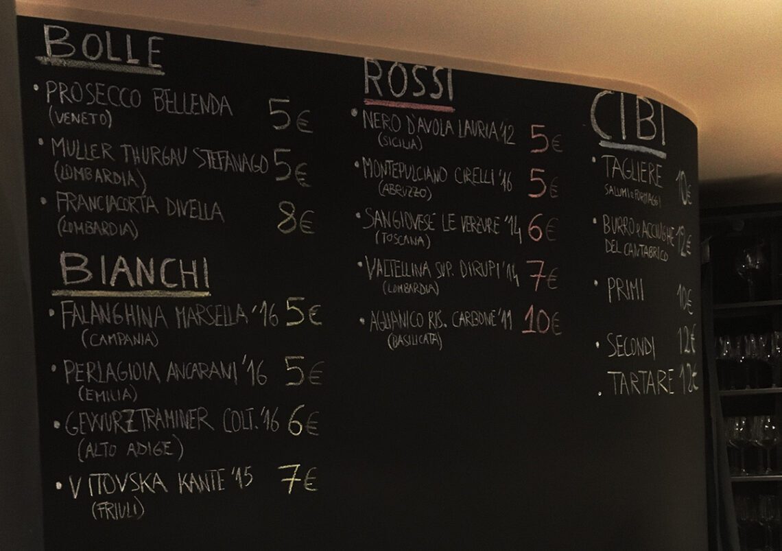 La selezione dei vini al calice è disponibile in una lavagna dietro il bancone, con più di una decina di etichette, più qualche sorpresa non in lista ma pronta per i clienti.