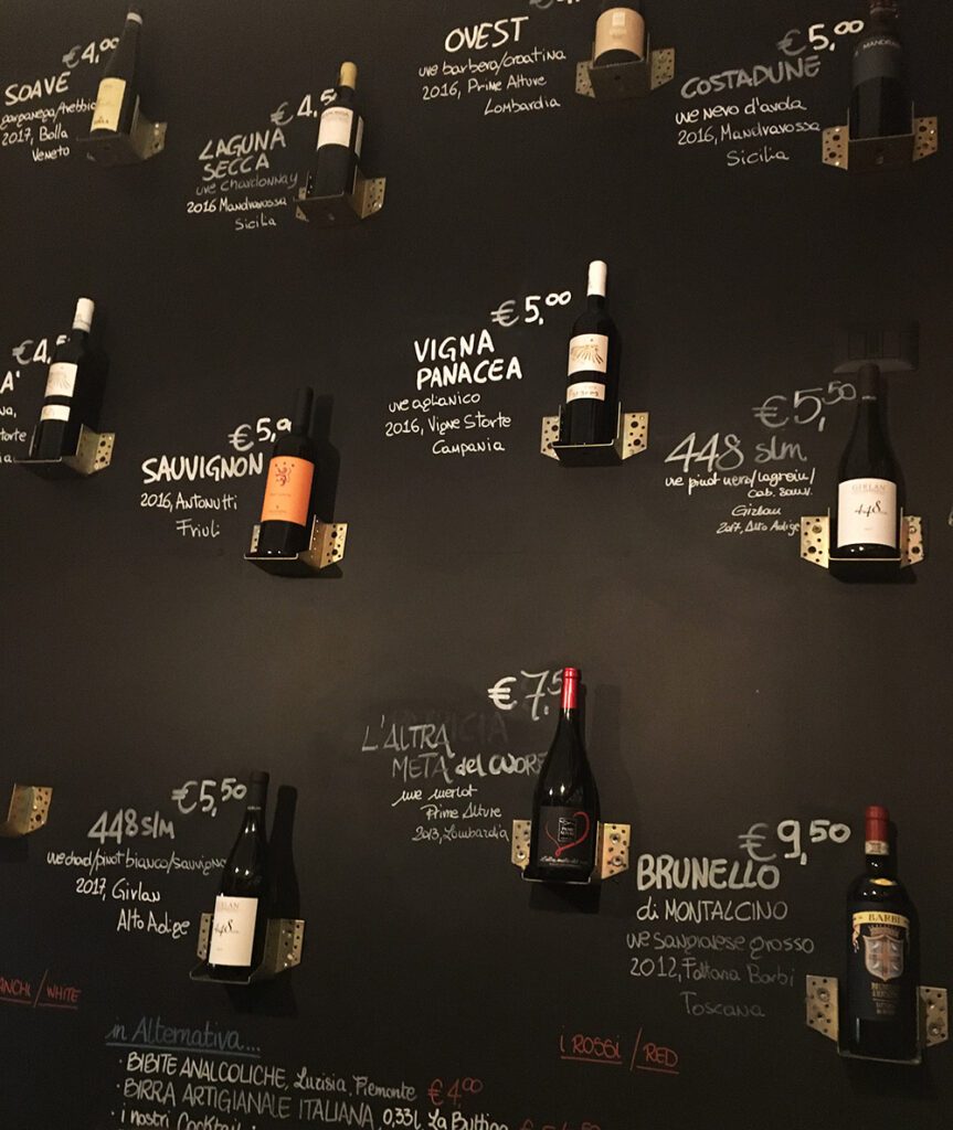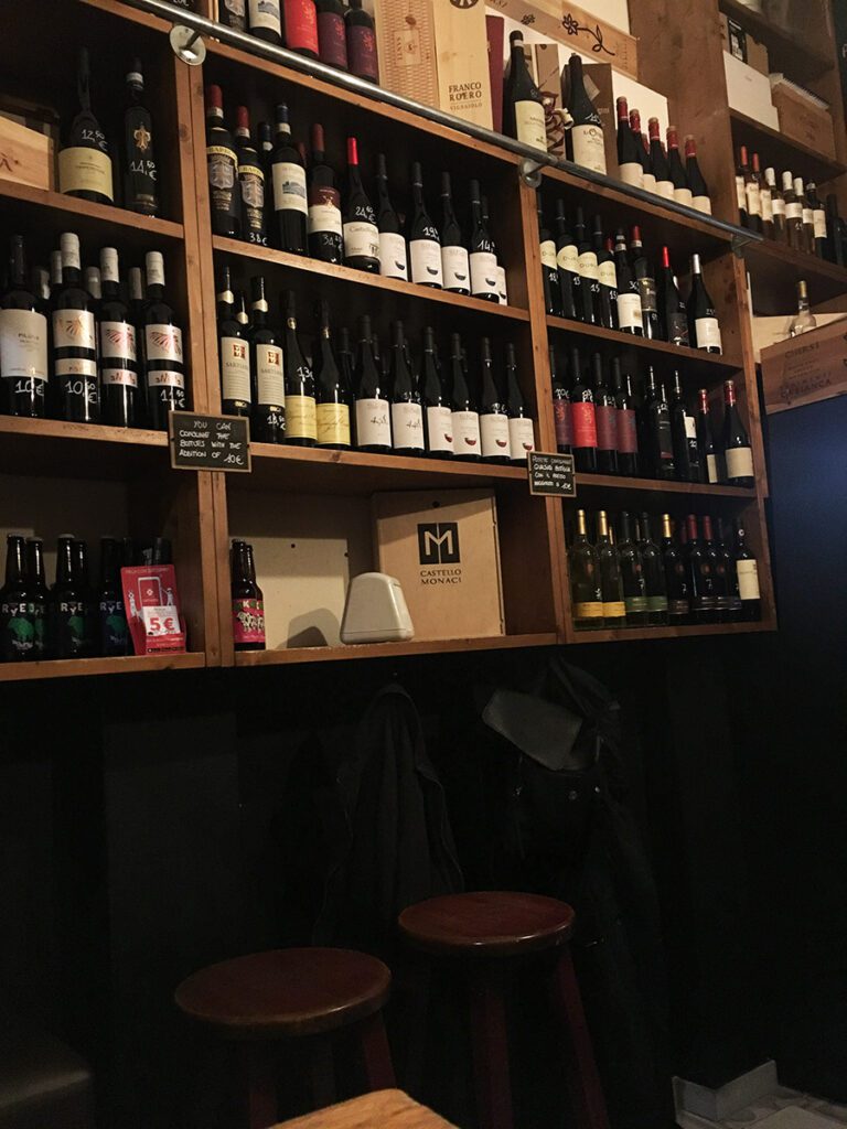 All’interno l’enoteca è piacevole e con pochi fronzoli. Bella l’idea dei vini al calice con le bottiglie appese alla parete frontale, ma anche fuori la lavagna con i vini è facilmente individuabile. Tutte le altre pareti all’interno vengono usate come scaffalature per i vini che si possono anche acquistare da asporto.