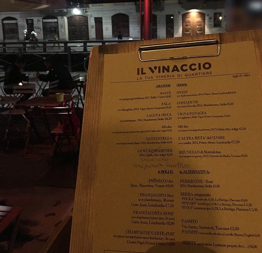 Il Vinaccio gode di una posizione ottima sulla Ripa di Porta Ticinese. Il nome gioca ovviamente sull’ironia, non è la mescita migliore di Milano, ma in piena Ripa è uno dei posti dove per il vino si beve meglio.